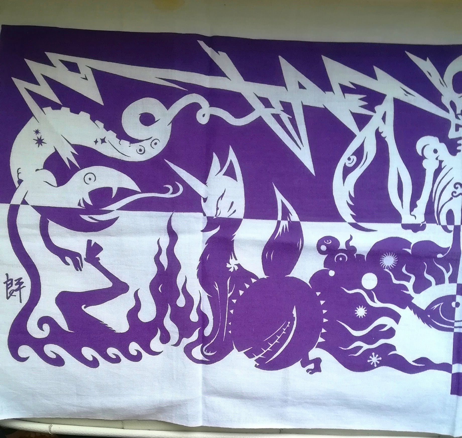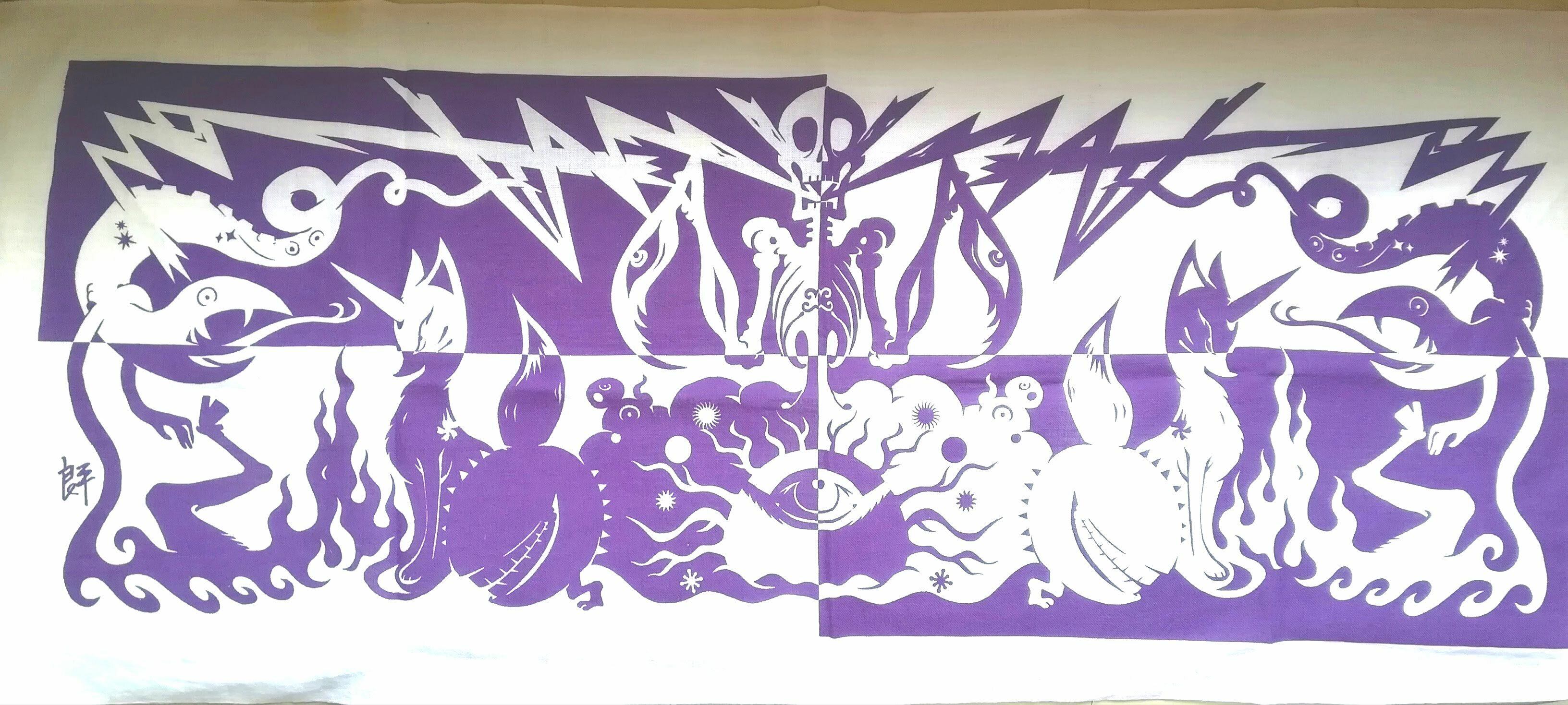 切り絵でデザインされた珍しい妖怪切り絵手ぬぐい。ハサミを使い紙を半分に折って切りあげるスタイルで、自然とシンメトリーになる作品は独特の雰囲気で他にはない特別な一品になるでしょう。